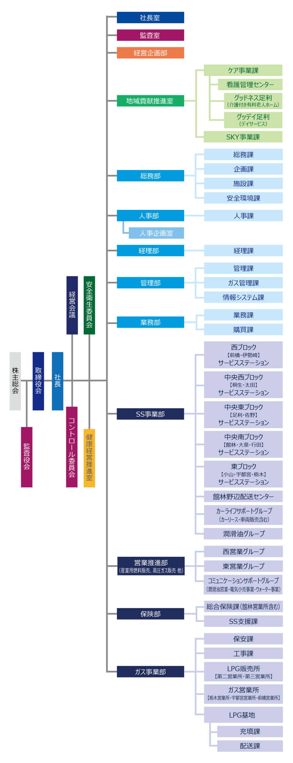 企業情報メニューはこちら 組織図 組織図 企業情報 ホームご挨拶経営理念会社沿革会社概要組織図グループ企業一般企業主行動計画個人情報の取り扱い反社会的勢力に対する基本方針本社アクセス 事業案内SS事業LPガス事業物流事業(両毛通商)総合保険事業電力小売事業ウォーター事業介護事業ドローン事業 サステナビリティ健康経営SDGsCSR・地域貢献活動 企業情報採用情報お問合せ ページトップに戻る 企業情報 ホームご挨拶経営理念会社沿革会社概要組織図グループ企業一般企業主行動計画個人情報の取り扱い反社会的勢力に対する基本方針本社アクセス 事業案内SS事業LPガス事業物流事業(両毛通商)総合保険事業電力小売事業ウォーター事業介護事業ドローン事業 サステナビリティ健康経営SDGsCSR・地域貢献活動 企業情報採用情報お問合せ
